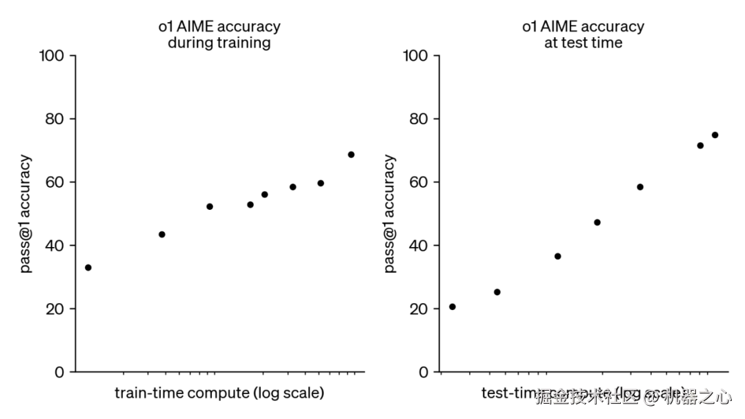 OpenAI 发现也证明了这一点:随着更多的强化学习(训练时计算)和更多的思考时间(测试时计算), o1 的性能也在不断提升,并且 Post-Training Scaling Laws 还没有被完全探索。