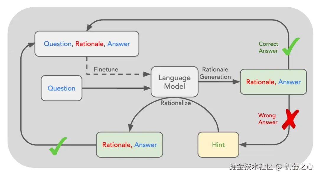 STaR 的核心思路是利用 LLM 已有的推理能力,迭代式的 Bootstrap 模型产生合理推理过程(Rationales) 的能力,并将 Rationales 融入到训练过程内,让模型学会进行推理。