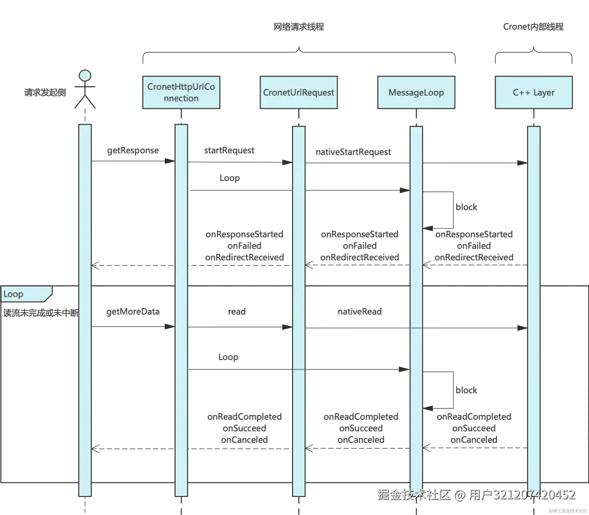然后在 okhttp interceptor 中已经是子线程的执行环境,如果仍然传入独立对 executor,会造成不必要的线程切换和时间消耗。通过查看 Cronet 源码,发现其 CronetHttpURLConnection 使用的 MessageLoop 类实现是在当前线程,使用 MessageLoop 即可减少不必要的多余线程引入。
