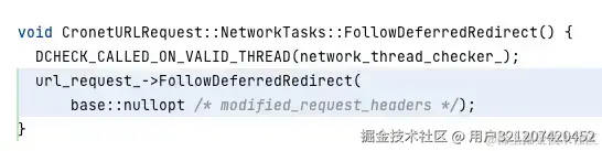可以看到,cronet 下层接口是支持对重定向时传入修改的 header 的,但是默认传入了空,也没有提供暴露给 java 侧的接口来进行设置。