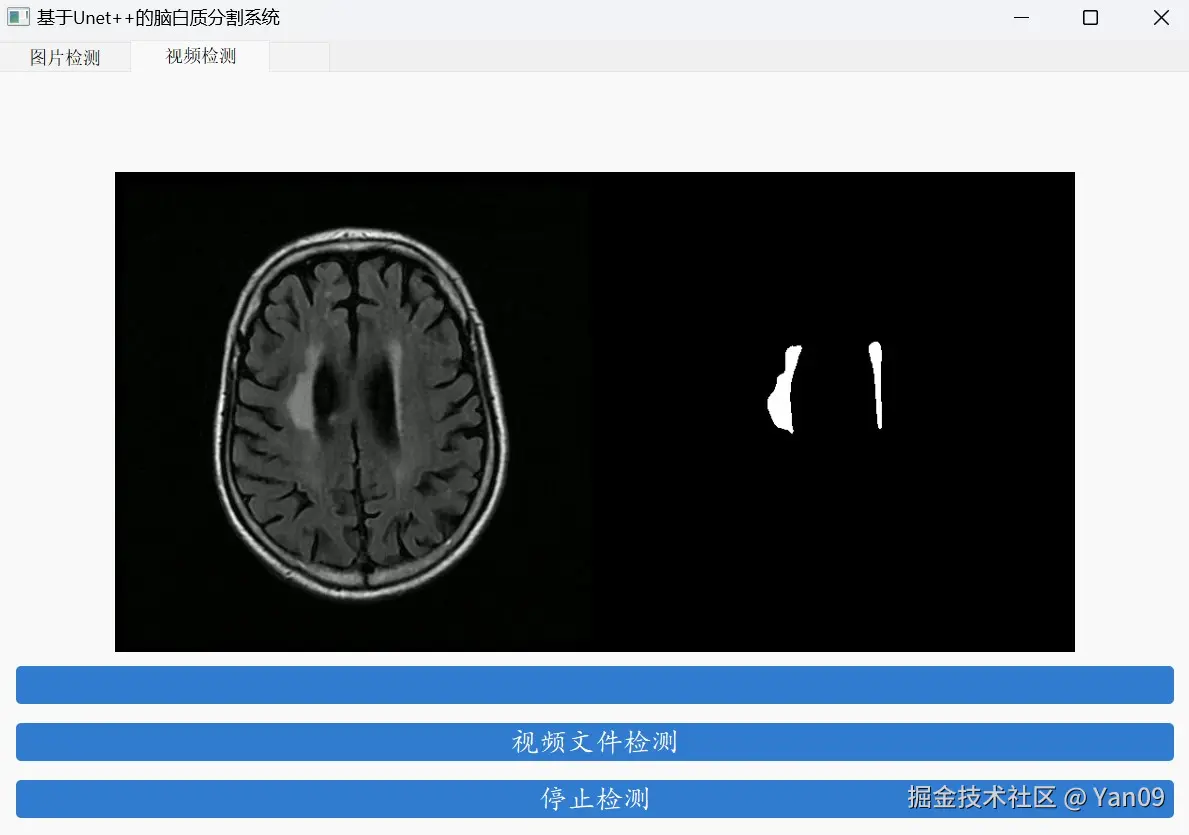 基于深度学习的脑白质高信号提取系统—测试用例 Yan09 2024-09-15 88 阅读1分钟 系统介绍 基于 Pycharm 平台和 Pytorch 框架,使用医学图像数据集对神经网络模型U-Net++进行训练,制作一个能够提取脑部核磁共振图像中高亮区域的系统。高亮区域为高信号区域,代表可能存在的组织病变。本系统有助于提高医疗人员的工作效率。 主要功能 图片检测:上传单个MRI图片进行分割提取,同界面下用黑白二值图展示分割结果,其中白色为高信号区域 视频检测:上传一段视频,由不同张MRI图片组成,同界面下用黑白二值图展示分割结果,可以停止检测 系统界面 图片检测: 视频检测: 测试用例
