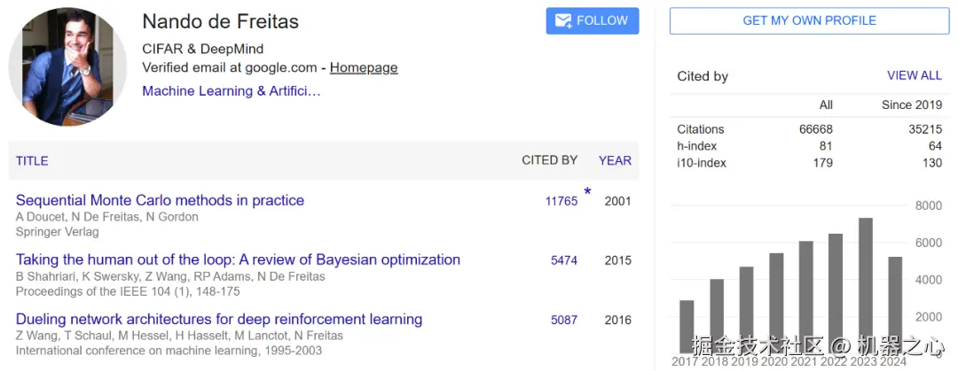 在 Google Scholar 上,Nando de Freitas 的论文引用数接近 7 万,其中《实践中的顺序蒙特卡洛方法》引用次数超过一万一千次,h-index 更是高达 81,在机器学习研究领域可谓大咖级人物。