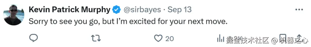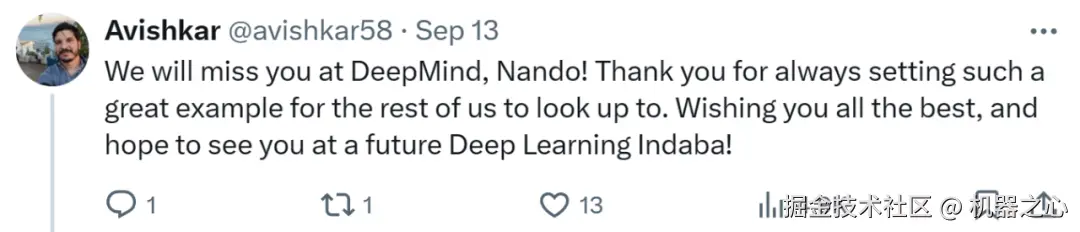 9 月 13 日,Nando de Freitas 发推表示自己要离开工作 10 年之久的谷歌 DeepMind 了。「过去无疑是人工智能历史上最激动人心的几年, 自己的成长已经超出了预期,感谢我的那些聪明、慷慨且乐于助人的同事们。」