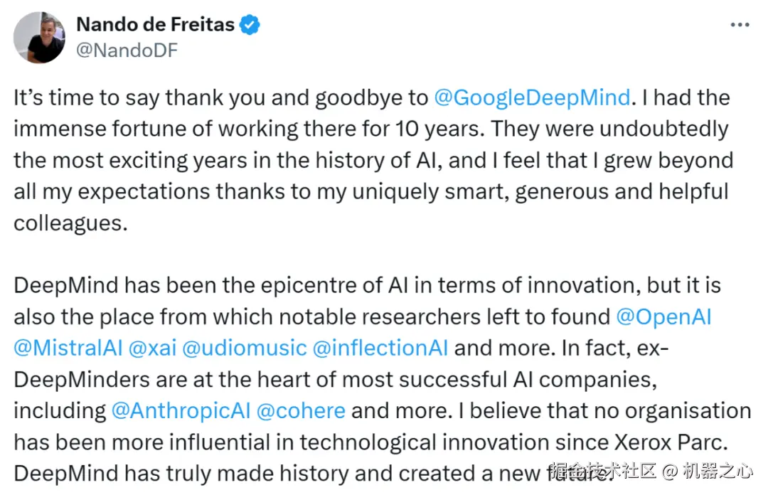他接着写到,DeepMind 一直是人工智能创新领域的中心,很多著名的研究人员从这里离开并创立了 OpenAI、Mistral、xAI、UdioMusic、InflectionAI 等公司。事实上,前 DeepMind 员工已经成为大多数成功 AI 公司的核心,包括 AnthropicAI 和 Cohere。