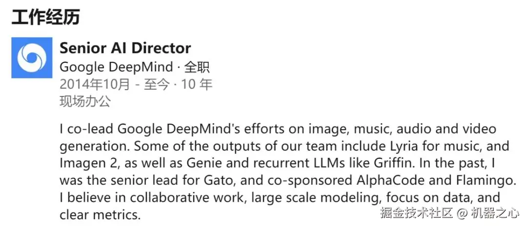 他还是通才 AI 智能体 Gato 的高级负责人,并共同发起了 AI 编码工具 AlphaCode 和视觉语言模型 Flamingo 项目。