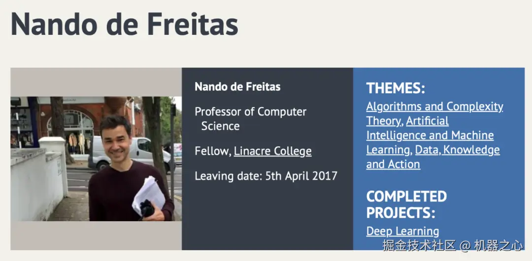 同时自 2014 年起,Nando de Freitas 开始在谷歌 DeepMind 工作,并先后担任首席科学家、高级 AI 总监等职。