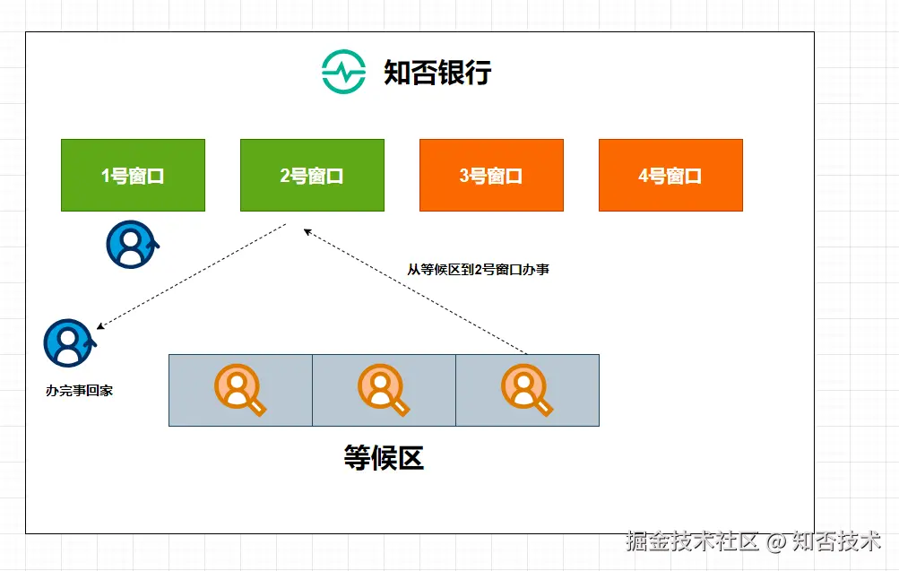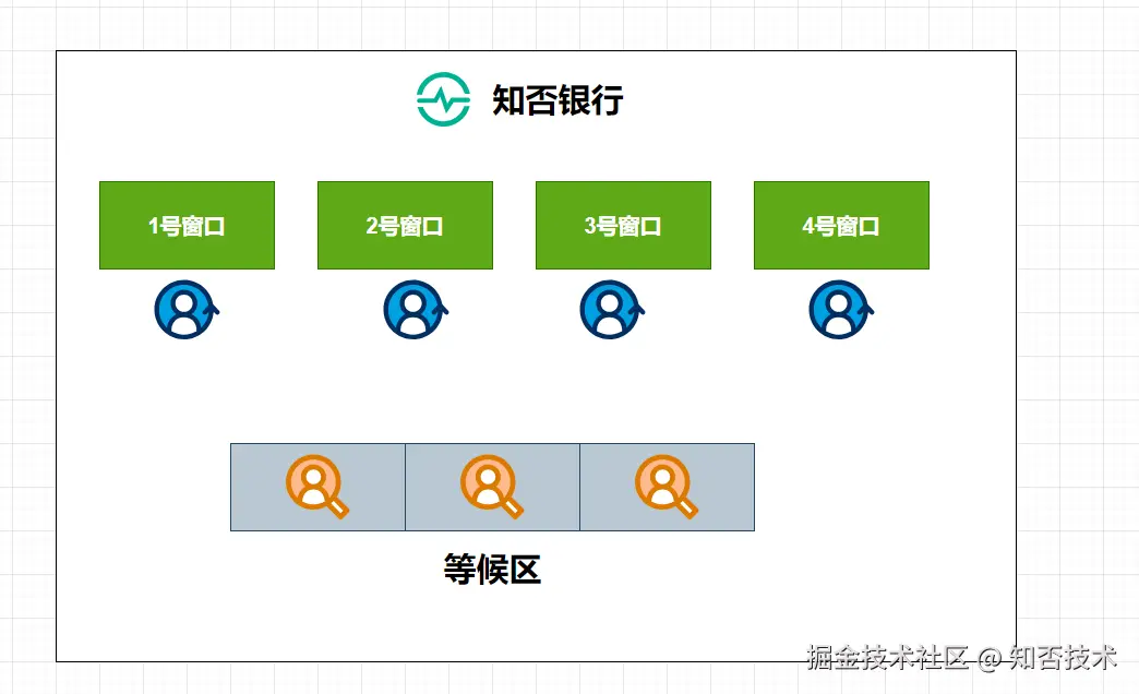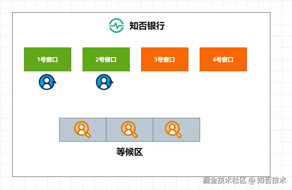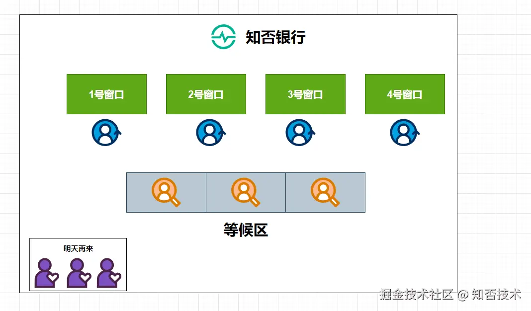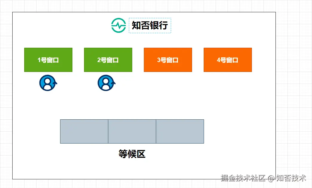 相当于此时去银行办事的用户数量有7人。前2个用户去1号2号窗口办事,另外3个去等候区。这时候银行会开启3号和4号窗口来给用户办理业务。