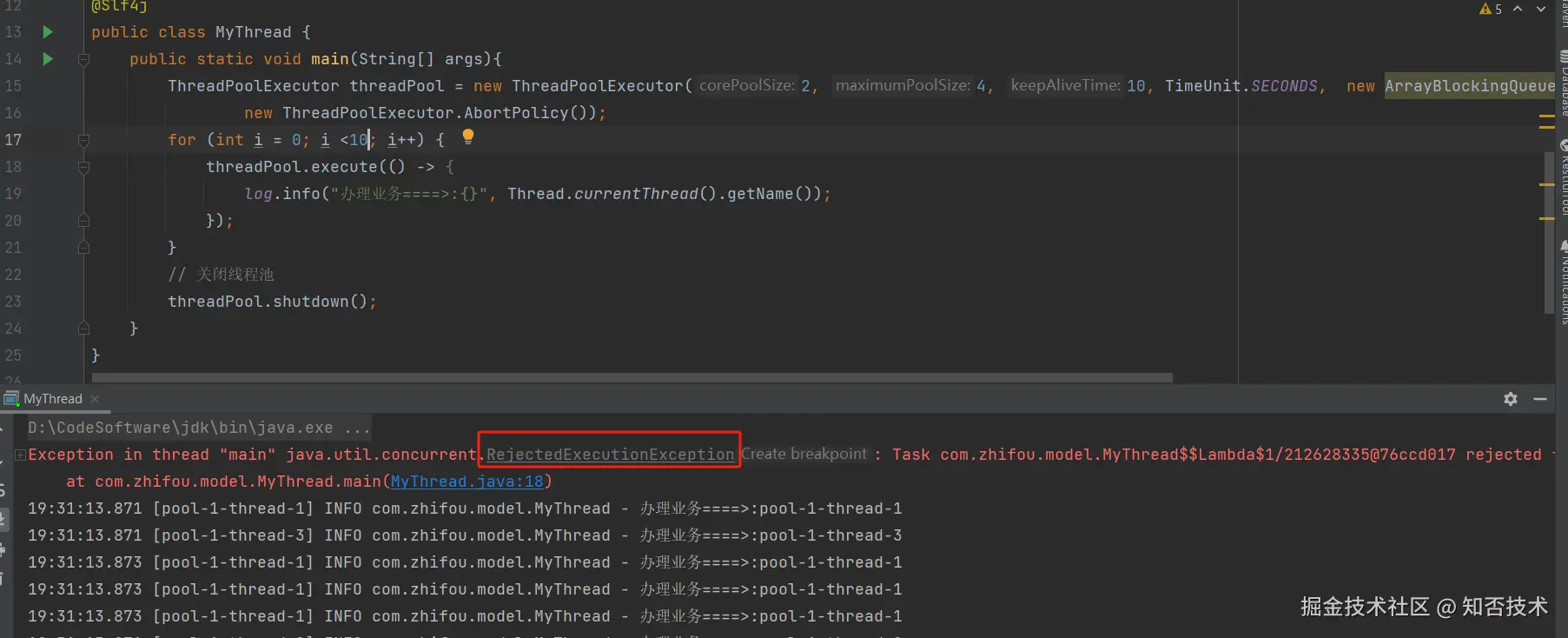 4.当执行的任务数量超过最大线程数和队列数之和,就会执行线程池的拒绝策略,默认是抛出异常。