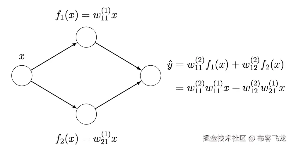 你可能会想,为什么对非线性激活函数如此 hype?或者,为什么我们不能在前一层的加权线性组合后直接使用一个恒等函数?使用多个线性层基本上与使用单个线性层是一样的。通过一个简单的例子可以看出。假设你有一个隐藏层神经网络,每层有两个隐藏神经元。