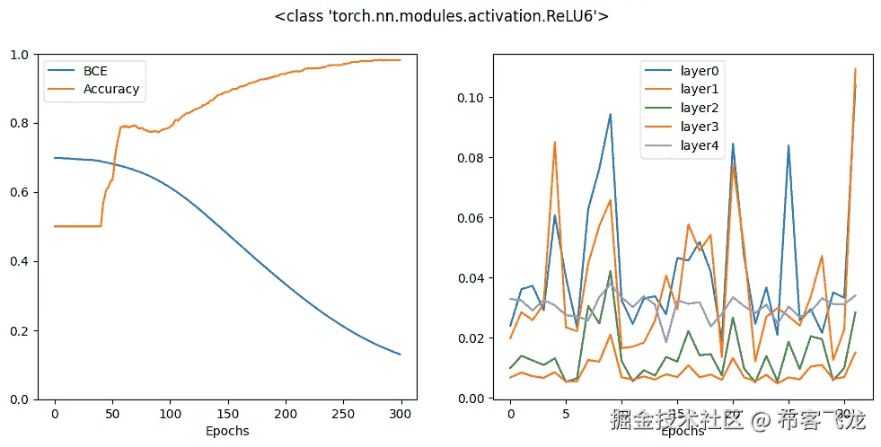 你可以看到,经过 300 个周期后,最终结果比 ReLU 激活函数差得多。实际上,你可能需要更多的周期才能使这个模型收敛。原因可以在右侧的图表中很容易找到,你可以看到梯度仅对输出层显著,而所有隐藏层的梯度几乎为零。这就是梯度消失效应,这是许多使用 sigmoid 激活函数的神经网络模型的问题。