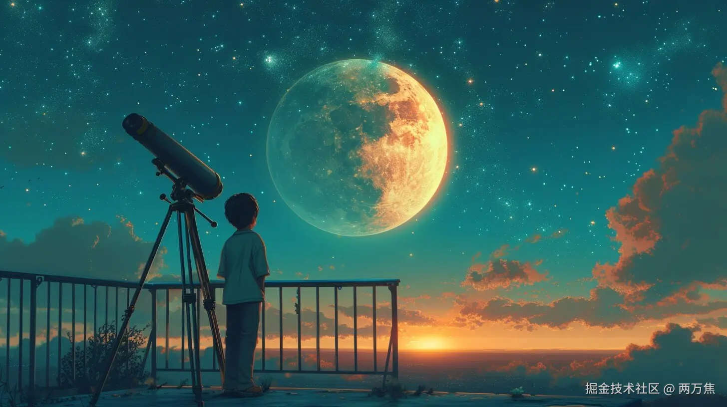 Prompt: In the tranquil ambiance of twilight, a child stands on an elevated platform, flanked by a trusty telescope, immersed in the act of stargazing. The horizon is painted with soft gradients of sunset hues, while an extraordinarily large, detailed moon dominates the celestial scene above, glowing amidst the tapestry of the starry night sky. This stirring image captures the infinite curiosity and wonder of childhood, symbolized by the vast universe laid out before the young observer's wide, awe-struck eyes.