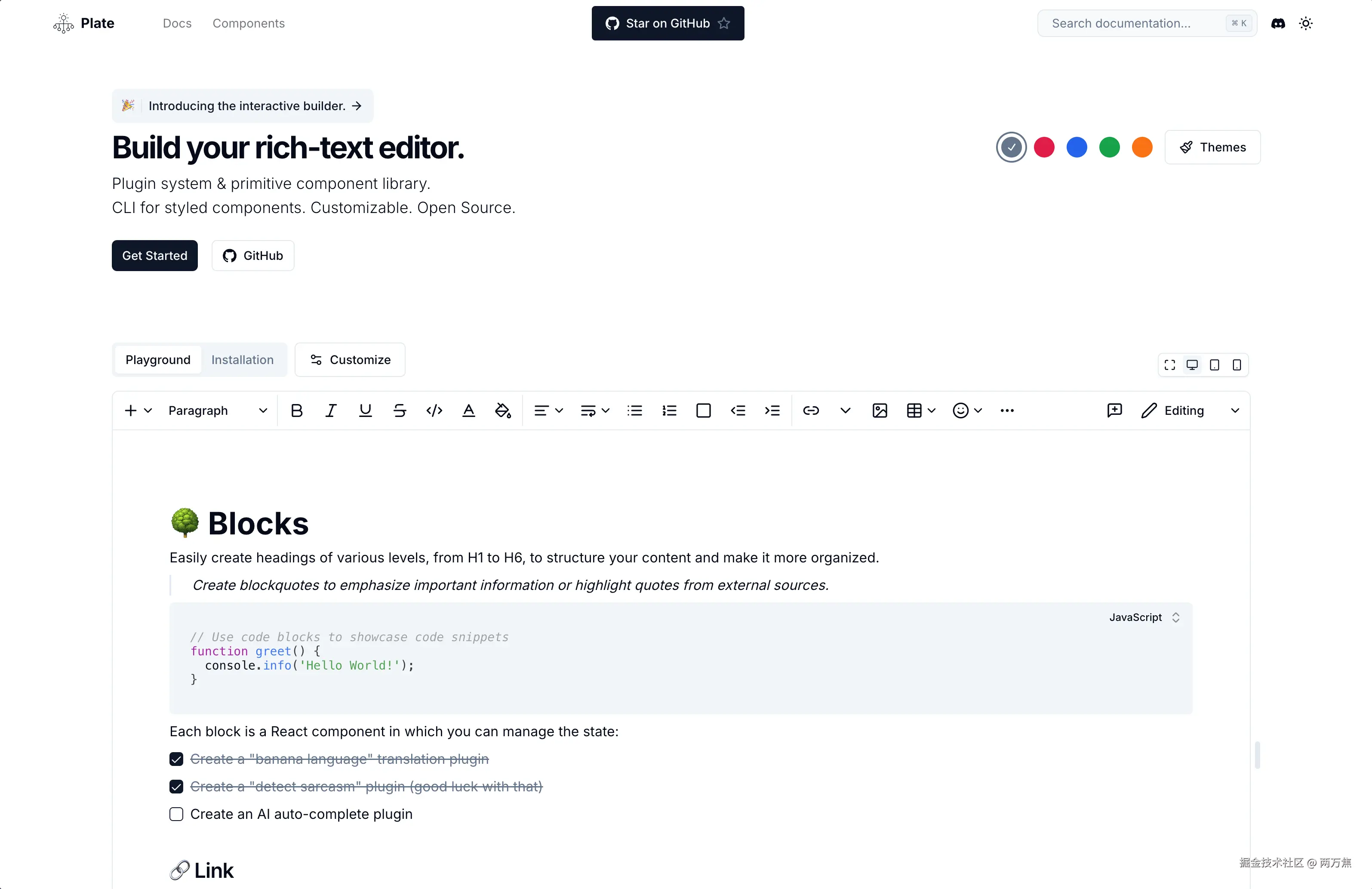 Plate:使用了 shadcn-ui 风格的富文本编辑器工具,极简的风格看起来很舒适