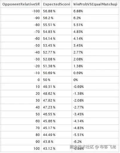 最后,我创建了一个表格,在给定对方球队的相对 SR 的情况下,计算你的球队的预期得分,以及如果比赛在两个得分相等的球队之间进行,你的获胜概率的差异。