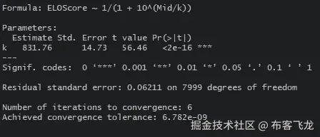 logFit <-nls( ELOScore ~ 1 / (1 + 10^(Mid/k)), start = list(k = 200) , data = simOutput)