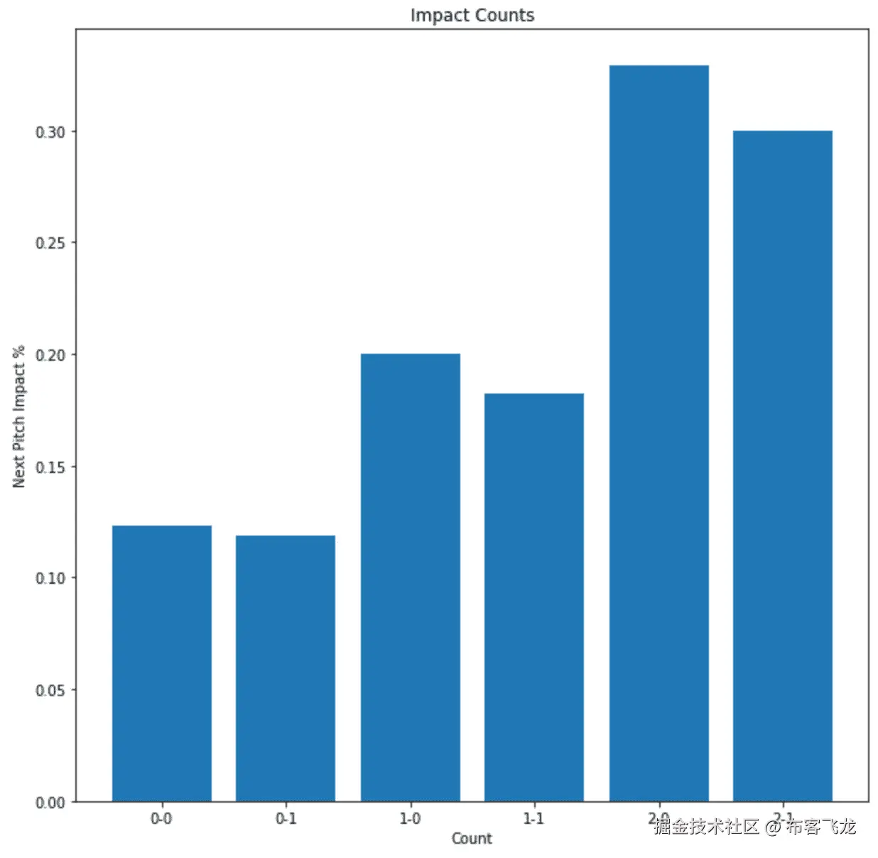在第一个问题的基础上,确定一个击球手投球的权重也可以从热图中看出,但计算是在分析的基础上进行的。因为有三个球或两个好球的计数不能被强调,因为任何一个方向的增加都将是保送或三振出局,我们可以专注于击球时的中间计数。我们正在计算下一次投球影响% ,方法是查看如果你在下一次投球中得到一个球,OBP 增加的量加上如果你在下一次投球中得到一个好球,OBP 减少的量。我们使用每一个的绝对值,因为一些计数会因为球是正的而打击是负的而被抵消。