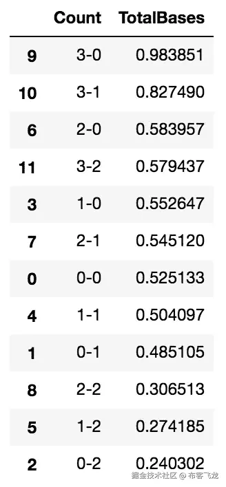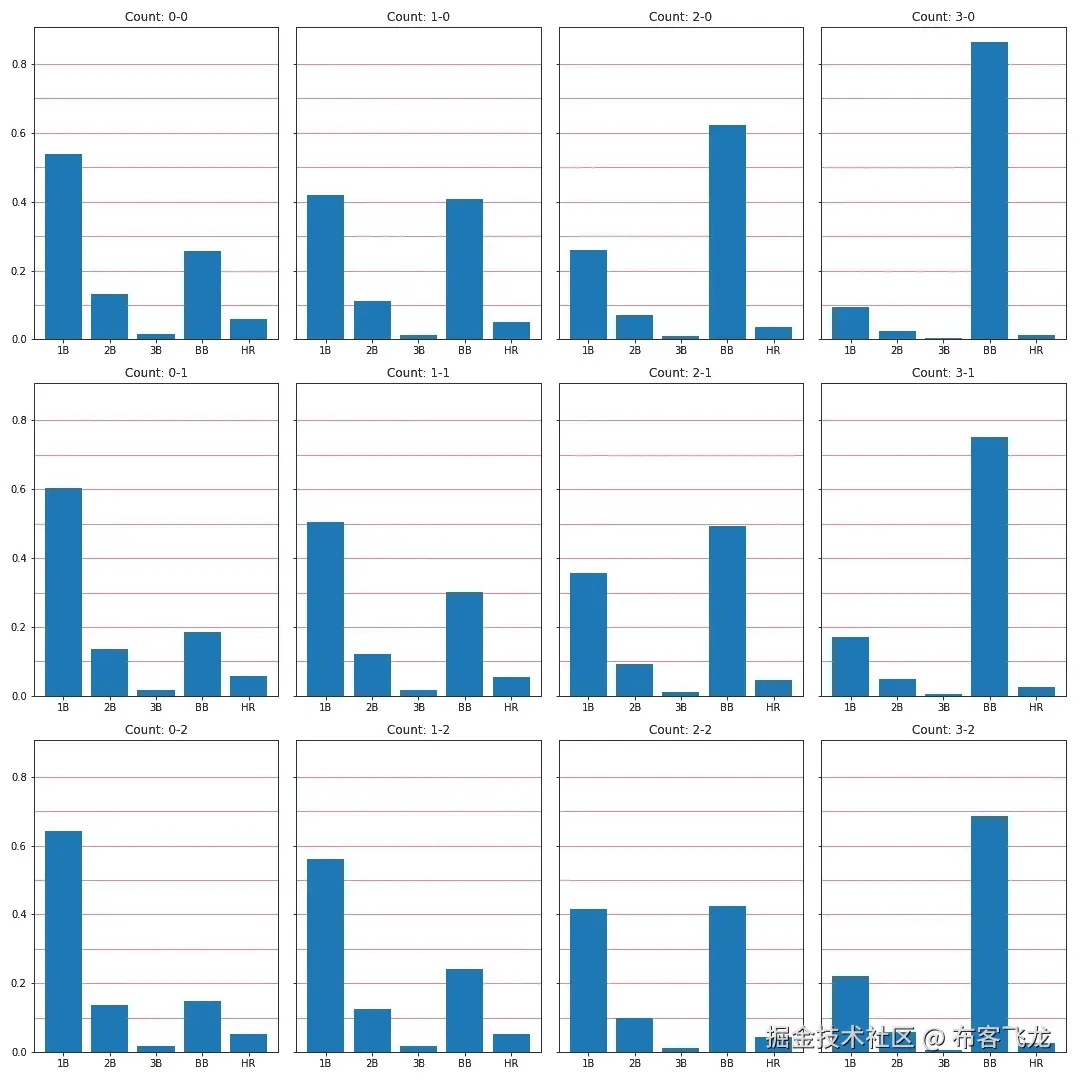 正如大多数棒球迷所期待的那样,你上垒的最好机会是在 3 比 0 的时候,因为你最有可能保送,也最有可能三振出局。根据同样的逻辑,你最差的得分是 0-2,因为投手有更多的机会三振你,而且不用担心保送击球手。