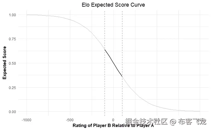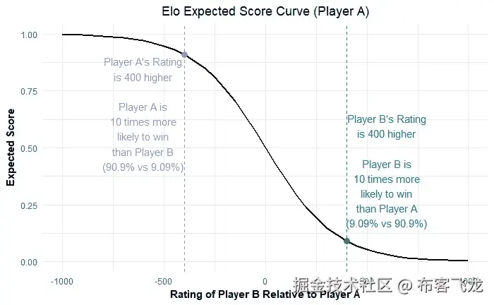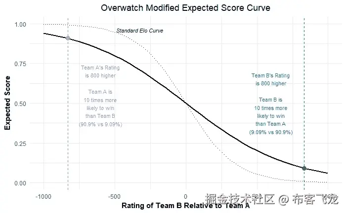 每超过对手一个评分点,玩家 A 获胜的可能性增加 0.069%,而对手每超过一个评分点,玩家 A 获胜的可能性减少 0.069%。不是那么巧合,这是使用标准 Elo 曲线(的变化率的一半,你觉得这是为什么?)。