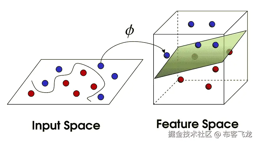 如果数据在原始或输入空间中不是线性可分的,那么我们对数据应用变换,将数据从原始空间映射到更高维的特征空间。目标是在转换到更高维度空间之后,类别现在在这个更高维度特征空间中是线性可分的*。然后,我们可以拟合一个决策边界来划分类别并进行预测。决策边界将是这个高维空间中的超平面。*