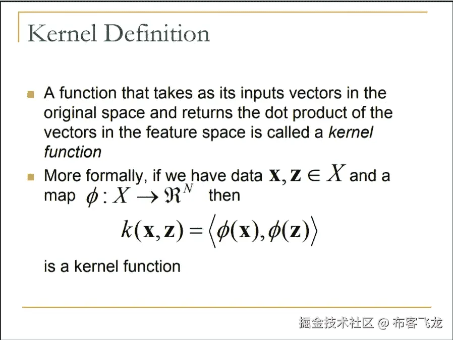我们的核函数接受原始低维空间中的输入,并返回高维空间中的变换向量的点积。在某些条件下,也有定理保证这种核函数的存在。
