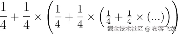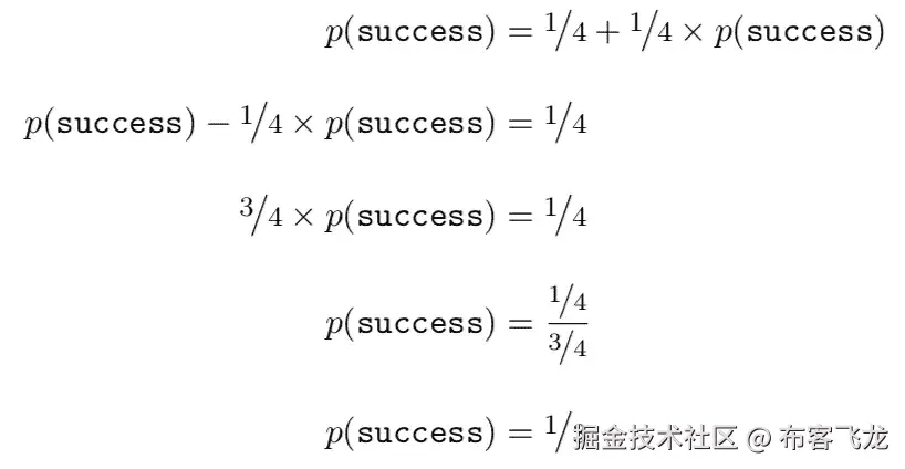 注意,省略号表示这个表达式无限重复。这导致了一个难以置信的数学上的便利方法来证明这确实导致了三分之一的概率。如果我们将整个无穷和定义为 s ,我们可以观察到,如果这个无穷级数有一个有限和,那么我们有下面的递归