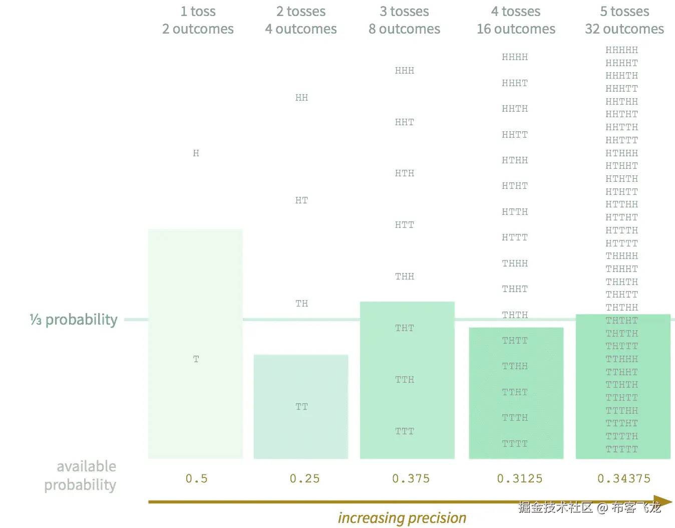 在我脑海中盘旋的意识混合物所带来的问题如下。如果我掷一枚公平的硬币,它正面朝上的几率是一半。如果我扔两次,连续两次人头落地的几率是四分之一。从这样一个随机来源中还能构建出其他什么概率呢?有没有可能把一个公平的硬币,一个我以前认为只能产生 2 的幂概率的东西,变成一个强大得多的东西?一个很好的例子,也是我在接下来的几天里一直坚持并思考的一个例子,是三分之一的概率。这听起来很容易,但它确实难倒了我。我绝对不可能去研究这个问题,剥夺自己解决这个问题的满足感。我决心看看下了这个兔子洞会把我带到哪里。