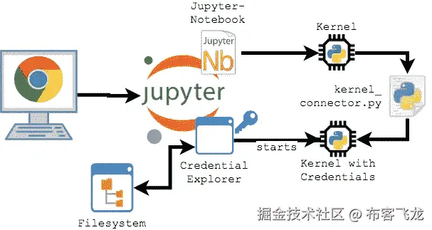 JupyterLab 凭证存储库利用了 Jupyter 的一个核心特性:生成缺省情况下相互独立的进程(内核)的能力。当您登录到凭证存储时,它会将解密的凭证放入一个新的 Python 内核中。为了获得凭证,您需要访问这个内核。因为每次启动凭证存储时内核的标识符都会发生变化,这增加了一定程度的混淆。