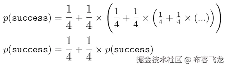 因此,“成功”的概率是四分之一(我们在第一次双掷中获得 HH ),加上四分之一倍的我们在任何未来双掷中获得它的概率,也就是四分之一(我们在第二次双掷中获得 HH )加上四分之一倍的我们在任何未来双掷中获得HH…