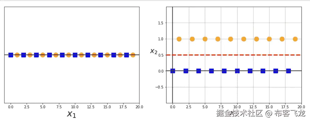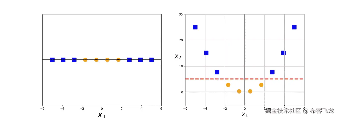 显而易见,很难将高维数据可视化,因此我们首先关注应用于一维数据的一些变换。在这个例子中,左边的图片显示了我们的原始数据点。在一维中,这些数据不是线性可分的,但是在应用变换 ϕ (x) = x 并且将第二维添加到我们的特征空间之后,这些类变成线性可分的。