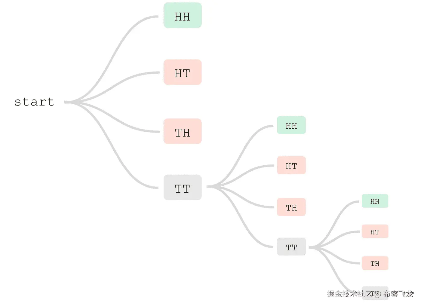 因此,我想到了一个简单得令人沮丧的解决方案。让我们再一次考虑我们期望的三分之一的概率。让我们回到掷硬币两次的想法。有四种可能的顺序。 HH 、 HT 、 TH 和 TT 。每一种都有四分之一的发生概率。所以如果成功是着陆,我们有四分之一的机会成功。现在,如果我们忽略结果,再试一次,如果我们得到了 TT 呢?现在,我们每个人都有四分之一的机会 HH 、 HT 和 TH 获胜,但也有四分之一的机会完全忽略结果,再次投掷硬币两次。然后,这最后的四分之一在第二次投掷的 HH 、 HT 、 TH 和 TT 之间平均分配,当然,最后的结果再次被忽略,重复这个过程,直到我们得到除 TT 之外的任何序列。