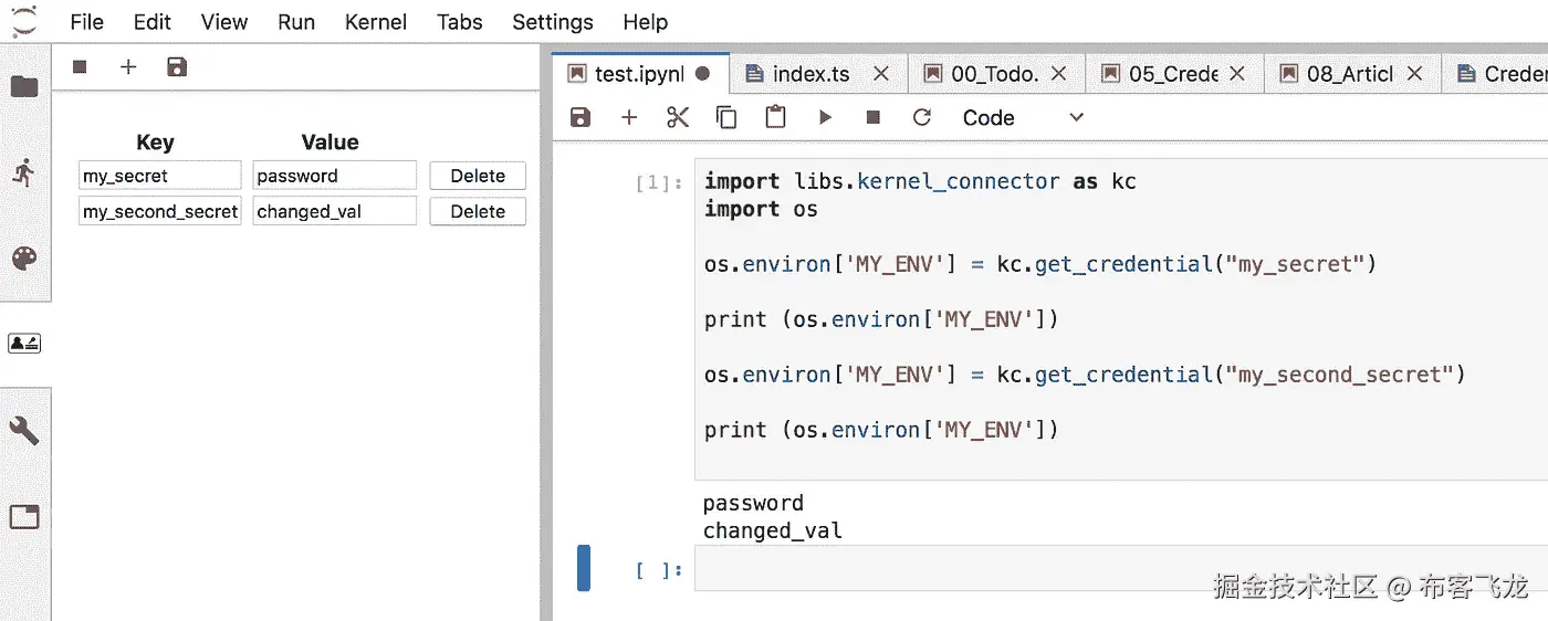 JupyterLab 凭据库使用 AES 加密保护您的凭据安全。在这个 JupyterLab 前端扩展中添加、编辑和删除作为键-值对的凭证。使用他们的密钥访问凭据: