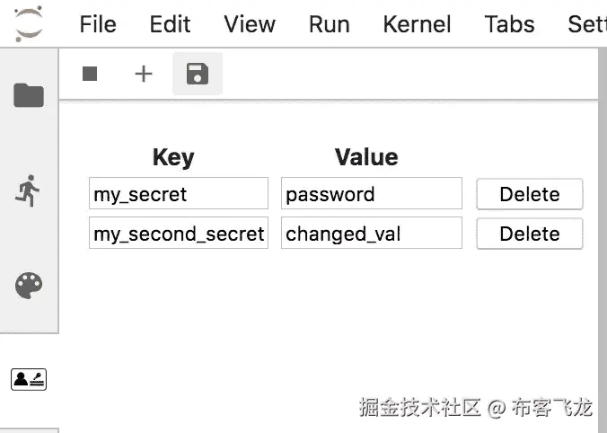 JupyterLab 凭据库保留了 Jupyter 笔记本的灵活性,同时确保您的凭据安全。这个 JupyterLab 扩展向您的工作区添加了一个凭证浏览器,您可以通过侧边栏上的菜单项打开它。在凭据资源管理器中,您可以添加、编辑和删除凭据的键值对。
