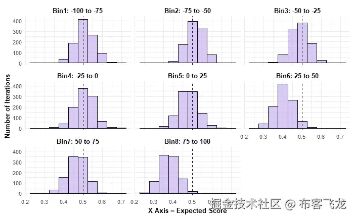 运行模拟后,我按 bin 汇总,这样我就可以很好地了解 bin 的预期得分分布。