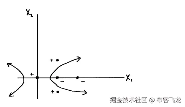 在下面的二维例子中,我们可以用三条线中的任何一条来分隔数据,然后根据观察值是在线的上方还是线的下方来分配类别。数据是由特征 X1 和 X2 指定的二维矢量,分类标签为 y =1(蓝色)或 y = 0(红色)。