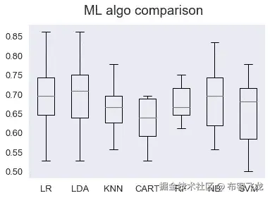 我们在这里所做的是在我们的数据点上运行所有 7 种算法,并尝试对其进行评估。如你所见,LR 和 LDA 表现最好。我们也可以实现一个比较图