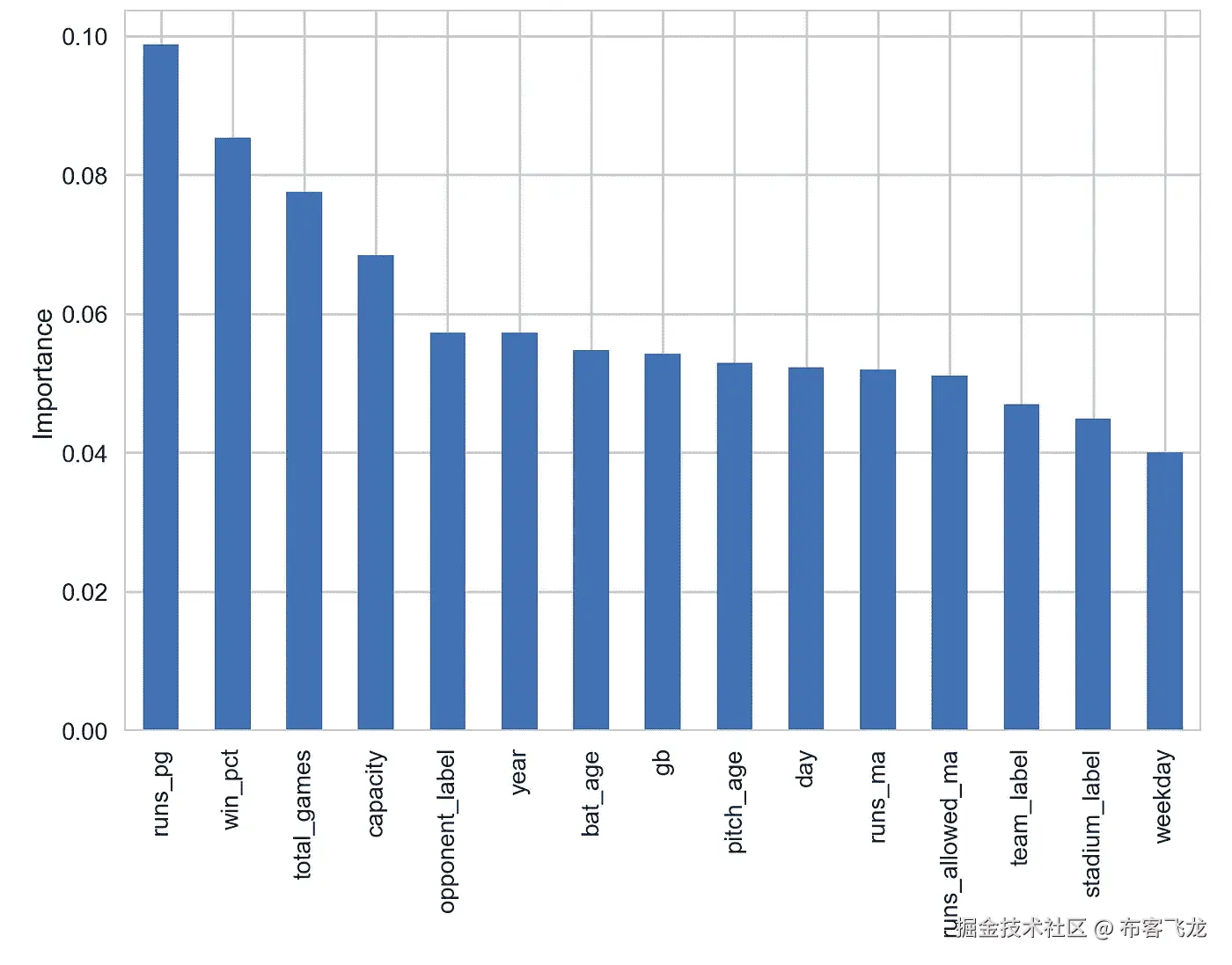 尽管随机森林和梯度增强树具有几乎相等的 AUC,但随机森林具有更高的准确率和 f1 值,分别为 99.27%和 99.44%。因此,我们有把握地说,随机森林优于其余的分类器。让我们看看随机森林分类器的特征重要性。