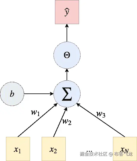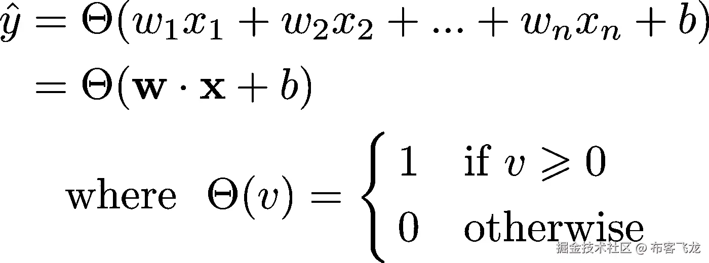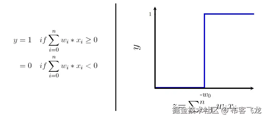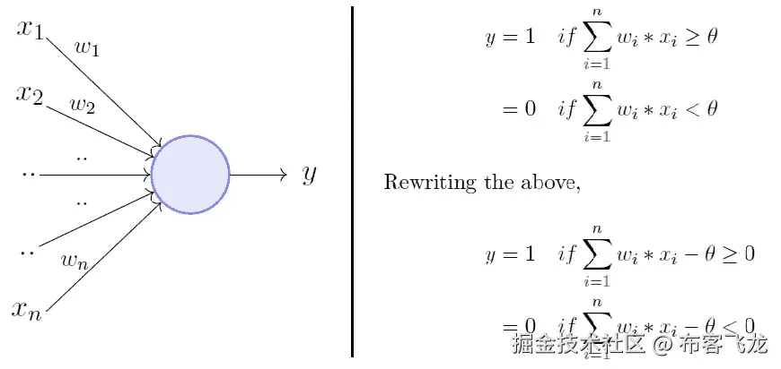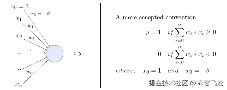 现在,这非常类似于 M-P 神经元,但是我们取输入的加权和,并且仅当和大于任意阈值( 、θ)时将输出设置为 1。然而,根据惯例,我们没有手动编码阈值参数 thetha ,而是将其添加为输入之一,权重为- theta ,如下所示,这使得它可以学习(在我的下一篇文章中会详细介绍这一点— 感知器学习算法)。
