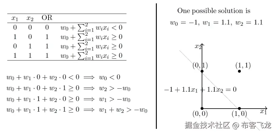 上面的‘可能解’是通过解左边的线性方程组得到的。很明显,解决方案将输入空间分成两个空间,负半空间和正半空间。我鼓励您尝试使用 AND 和其他布尔函数。