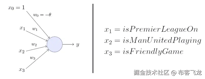 在这里, w_0 之所以被称为偏见,是因为它代表了先验(preference)。一个足球狂可能有一个非常低的门槛,可以观看任何足球比赛,而不考虑联赛、俱乐部或比赛的重要性[ theta = 0 ]。另一方面,像我这样的选择性观众可能只观看英超联赛的足球比赛,以曼联比赛为特色,并且不友好。重点是,权重和偏差将取决于数据(在这种情况下是我的观看历史)。