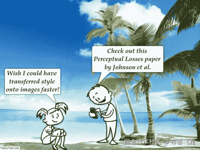 [Fig. 1] Two toons discussing Neural Style Transfer at the beach.