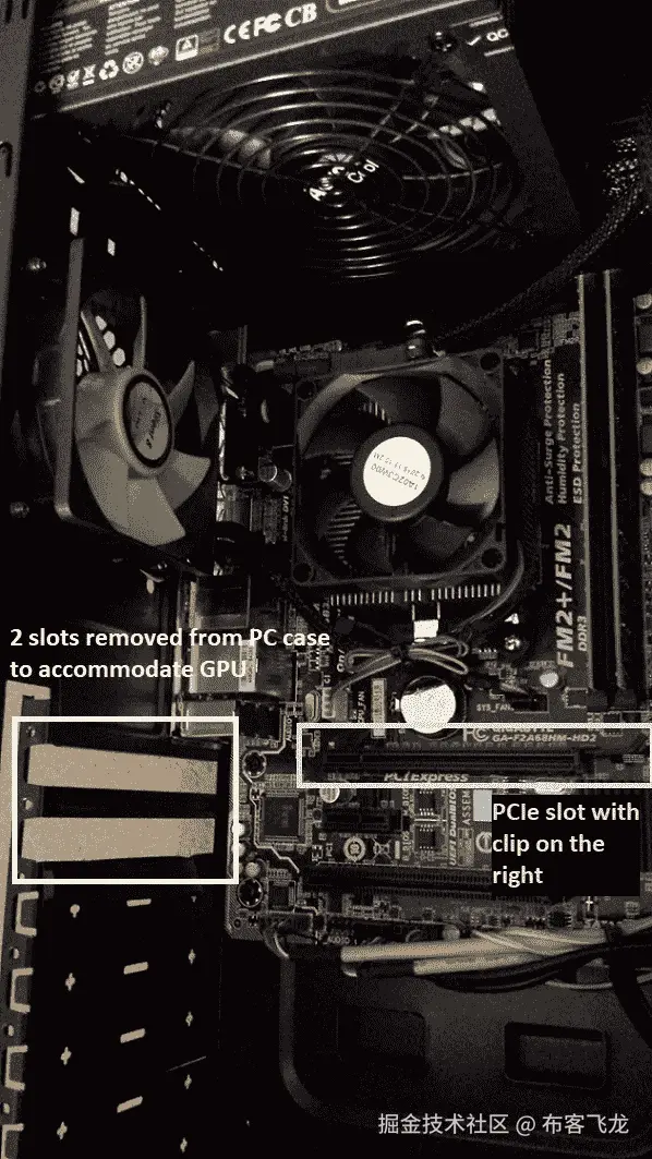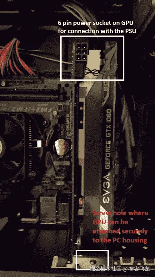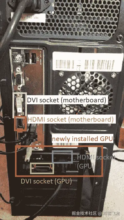 在安装 GPU 之前,我的显卡通过插入主板的 HDMI 电缆连接到我的 PC 显示器上;参见图 8 中的 HDMI 插座(主板)标签)。安装 GPU 时,它带有几个连接,包括自己的 HDMI 和 DVI 插座(在图 8 中分别标记为“HDMI 插座(GPU)”和“DVI 插座(GPU)”。当电脑仍然关闭时,我从主板上拔下 HDMI 电缆,并将其插入 GPU。然后我打开电脑,它重新启动进入 windows。如果在打开和启动之前没有将显示器连接器(HDMI 或 DVI)从主板插座切换到 GPU 插座,尽管您的计算机启动了,但您的显示器仍会出现黑屏。您的电脑现在可以在启动时识别 GPU,默认显示输出从主板切换到新的 GPU。