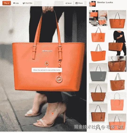 特别是,相似外观的实验允许 Pinterest 根据大头针图像中的特定对象显示视觉上相似的大头针推荐。它尝试了不同的方法来使用表面对象识别,这将使 Pinner 点击到对象。然后,它使用对象识别从大头针的图像中检测出包、鞋和裙子等产品。从这些检测到的对象中,它提取视觉特征来生成产品推荐(“相似的外观”)。在最初的实验中,如果针中的物体上有一个红点,Pinner 就会发现建议。点击红点会载入一系列视觉上相似的物品。