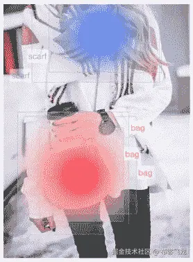 Pinterest 在构建自动对象检测方面的第一个挑战是收集图像中感兴趣区域的标记边界框作为我们的训练数据。自推出以来,它已经处理了近 10 亿个图像作物(视觉搜索)。通过在数百万张参与度最高的图片中聚合这种活动,它可以了解 Pinners 对哪些对象感兴趣。它将视觉上相似的结果的注释聚合到每个裁剪中,并在数百个对象类别中分配一个弱标签。下面的热图显示了这种情况的一个示例,其中形成了两个用户裁剪聚类,一个围绕“围巾”标注,另一个围绕“包”标注。