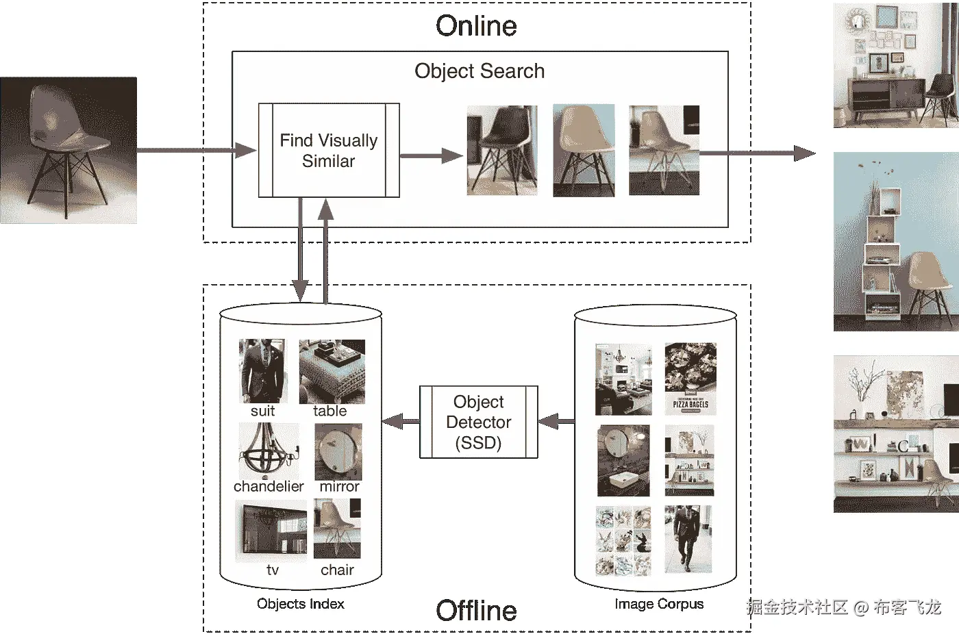 物体搜索是以物体为单位的视觉搜索系统。给定一张输入图像,Pinterest 在几分之一秒内从数十亿张图像中找到视觉上最相似的对象,将这些对象映射到原始图像,并返回包含相似对象的场景。