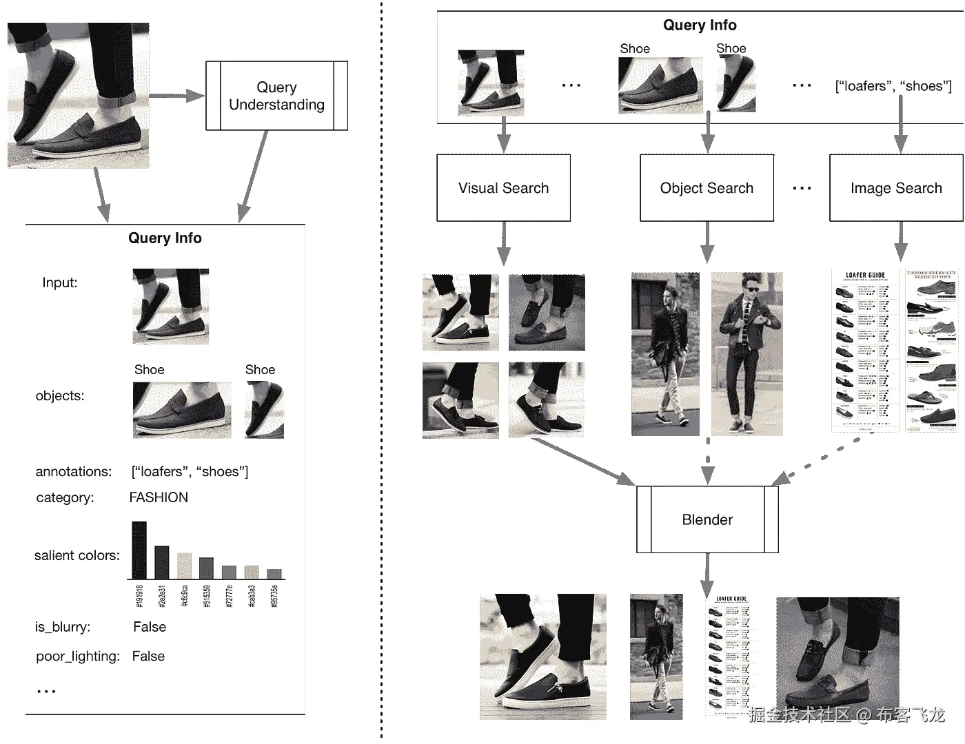 - 第二个组件是 Pinterest 的混合器,因为 Lens 返回的结果来自多个来源。Pinterest 使用视觉搜索技术返回视觉上相似的结果,使用对象搜索技术返回具有视觉上相似的对象的场景或项目,使用图像搜索返回与输入图像语义上(非视觉上)相关的个性化文本搜索结果。混合器的工作是根据查询理解层中获得的信息动态地改变混合比率和结果源。