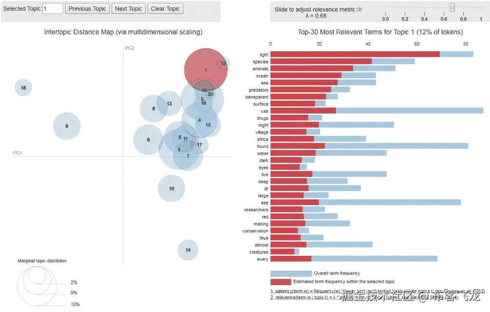 一旦模型运行,它就可以为任何文档分配主题了。当然,如果你的训练数据集是英文的,而你想预测中文文档的主题,这是行不通的。但是,如果新文档具有相同的结构,并且应该有或多或少相同的主题,它就可以工作。