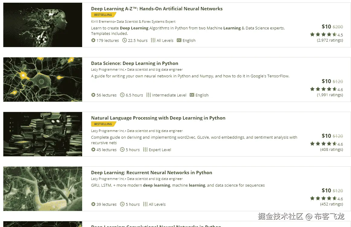 最后,在 Udemy 上快速搜索,你可以找到十几个深度学习课程的提供商以及相关的评级和参与者数量。它们现在都在打折,每个 10 美元。