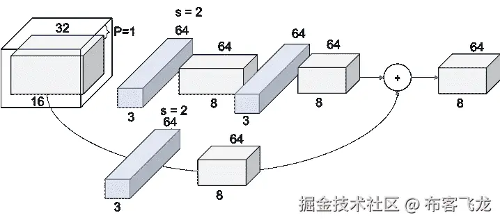 整个层 2 的最终外观如图 6 所示。我们可以看到步长为 2 的卷积是如何用于向下采样的跳过连接以及层的第一个卷积的。此外,我们可以根据文件中的表格检查,我们确实有一个 16x16x32 的体积。