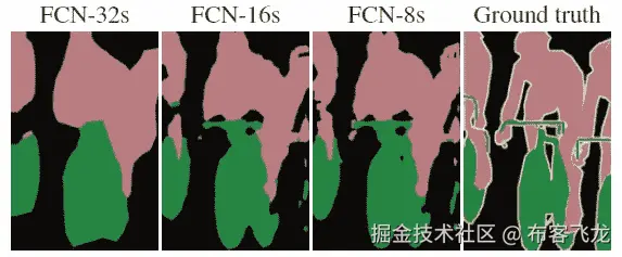 由于丢失了位置信息,FCN-32s 的结果非常粗略,而 FCN-8s 的结果最好。