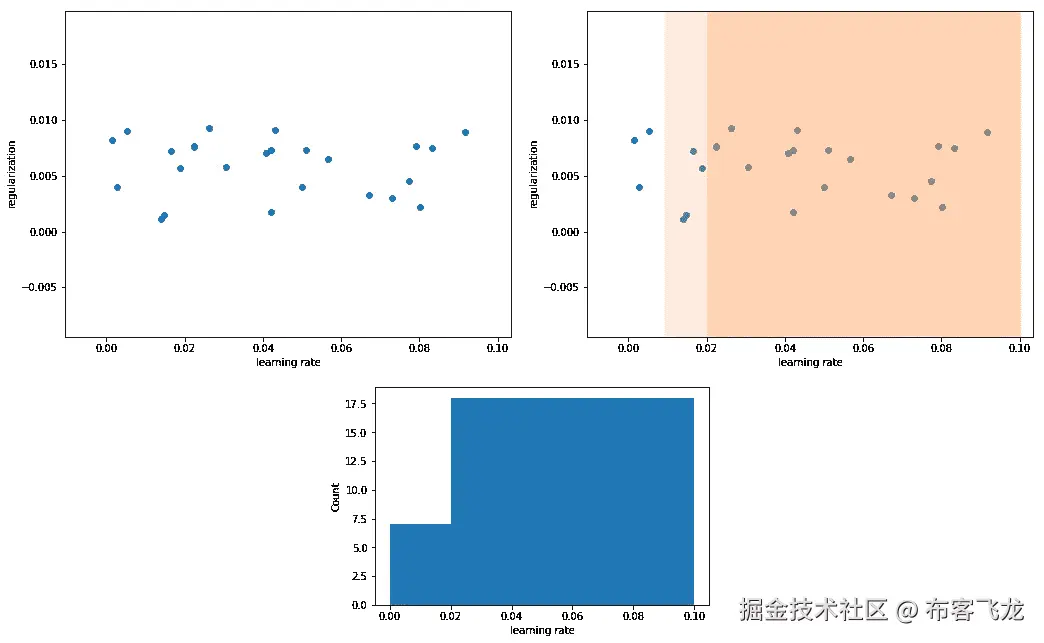 在这种情况下,大多数值不会从“有效”区域中采样。实际上,考虑到这个例子中的学习率样本,值的 72%将落在区间[0.02,0.1]中。