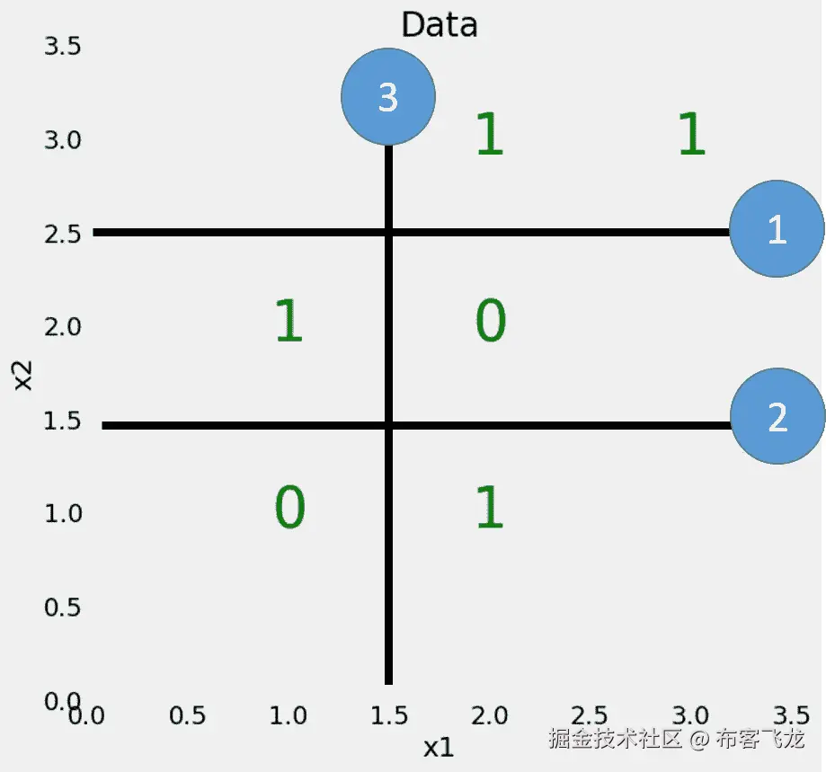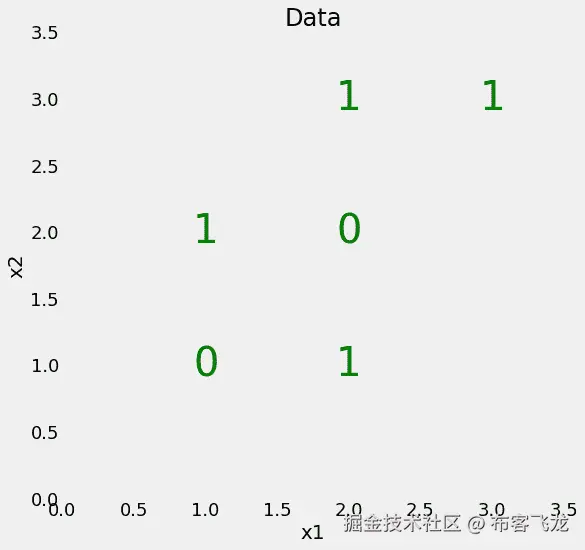 我们的数据只有两个特征(预测变量),x1和x2,6 个数据点——样本——分成 2 个不同的标签。虽然这个问题很简单,但它不是线性可分的,这意味着我们不能通过数据画一条直线来对点进行分类。